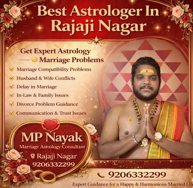 Residents of Rajaji Nagar Bangalore and nearby locations often look for experienced astrology consultants who provide personalized consultations. MP Nayak offers astrology guidance to individuals seeking support for relationship concerns, marriage compatibility, and family matters.