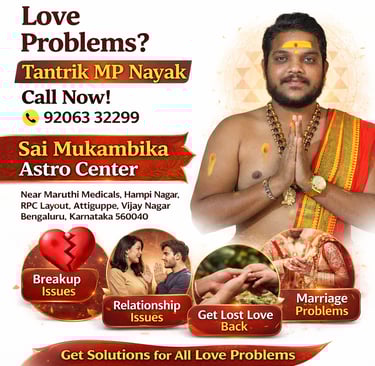 Are you facing difficulties in love, marriage, or personal relationships? At Sai Mukambika Astro Center, we provide professional astrology consultation and spiritual guidance services in Kengeri, Bengaluru, helping individuals overcome emotional stress and life challenges with clarity and confidence. Under the guidance of Tantrik MP Nayak, the center follows traditional Vedic astrology practices combined with practical advice for better decision-making.