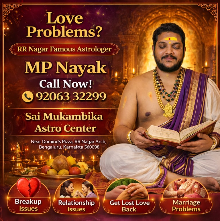 Are you facing serious love problems, relationship issues, or marriage conflicts? Looking for a trusted and experienced astrologer in RR Nagar Bangalore who can guide you with accurate predictions and effective solutions? Welcome to Sai Mukambika Astro Center, where MP Nayak Guruji, a renowned astrologer in RR Nagar, provides powerful astrology services to help you overcome life’s toughest challenges.