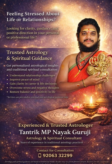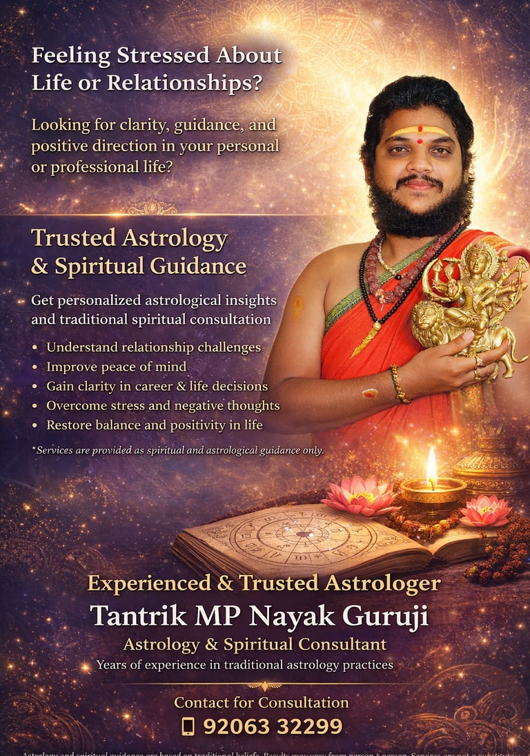 As an experienced astrologer, Tantrik MP Nayak Guruji focuses on personalized astrology consultations. Each session is conducted with patience, confidentiality, and respect, allowing individuals to openly discuss their concerns. People often consult a professional astrologer to gain insight into relationship compatibility, career planning, financial decision-making, or personal growth, and these services aim to support thoughtful decision-making.