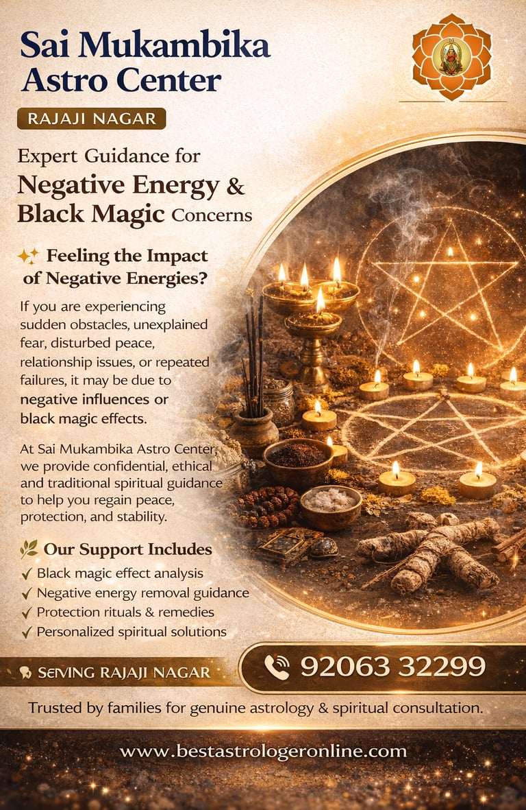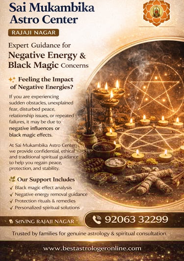 Sai Mukambika Astro Center is a trusted Black Magic Astrology Guidance Center in Vijayanagar, Bengaluru, offering traditional astrology-based consultations focused on spiritual awareness, emotional balance, and personal clarity. Our center follows ethical practices and cultural traditions to provide guidance for individuals who feel disturbed, stressed, or mentally unsettled due to unexplained challenges in life.