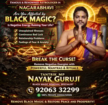 Tantrik MP Nayak Guruji is widely recognized as a trusted black magic removal specialist in RR Nagar, Bangalore, offering powerful spiritual remedies to eliminate negative energy and restore balance in life. With years of experience in astrology, tantra, and Vedic practices, Guruji has helped countless individuals overcome life obstacles and achieve peace, prosperity, and happiness.