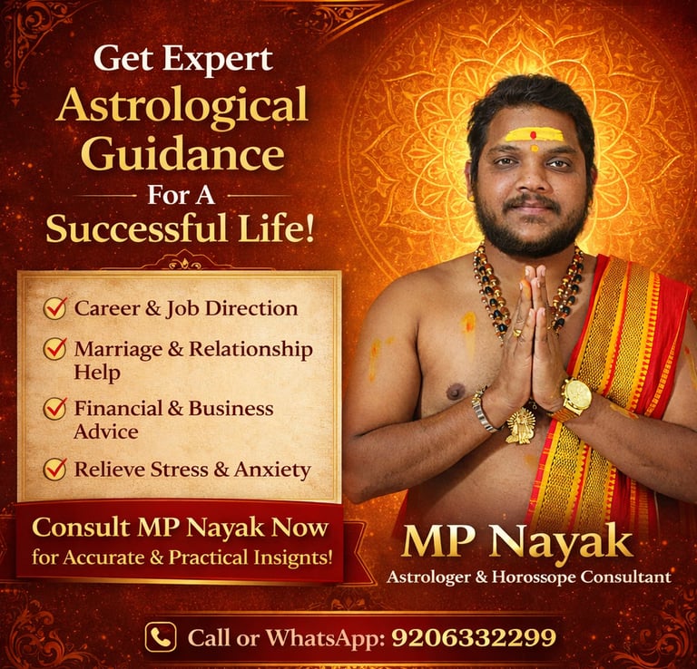 As a well-known astrologer in Bangalore, MP Nayak specializes in detailed horoscope reading, career astrology, marriage matching, relationship guidance, and financial astrology consultation. If you are confused about your career and job direction, facing delays in marriage, or dealing with misunderstandings in relationships, a professional horoscope consultation in Vijayanagar can help you gain clarity and direction.