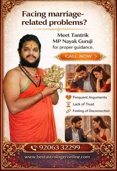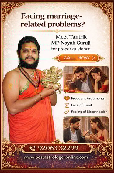 MP Nayak Guruji is a well-known name among people searching for a best astrologer for marriage problems in Vijayanagar. With years of experience in astrology and traditional spiritual practices, he offers ethical and confidential guidance to individuals and couples dealing with marital stress. Many marriage issues are influenced by planetary positions, compatibility concerns, and life-phase transitions, which can be identified through detailed horoscope analysis.