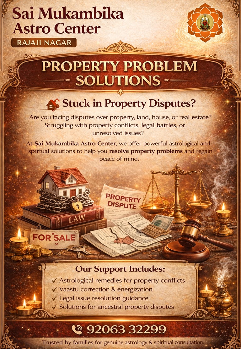 Property-related concerns can often become complex, emotionally challenging, and time-consuming. Issues related to land ownership, house disputes, ancestral property matters, or delays in property-related decisions may cause prolonged stress for individuals and families. At Sai Mukambika Astro Center in Rajaji Nagar, we offer traditional astrological consultation and guidance to help individuals better understand their property-related situations and explore supportive, faith-based remedies.