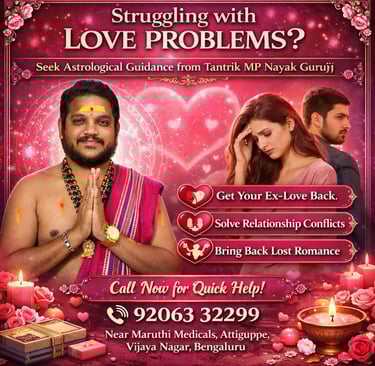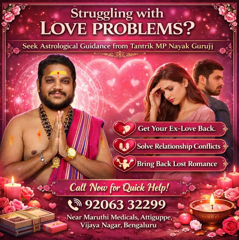 Are you facing serious love problems, relationship misunderstandings, or heartbreak in Vijayanagar? If you are searching for a trusted astrologer in Vijayanagar Bangalore, Tantrik MP Nayak Guruji offers personalized astrological guidance to help you find clarity and direction in your love life. With years of experience in traditional astrology and spiritual consultation, many people from Attiguppe, Vijay Nagar, and nearby areas consult for guidance regarding emotional stress and relationship concerns.